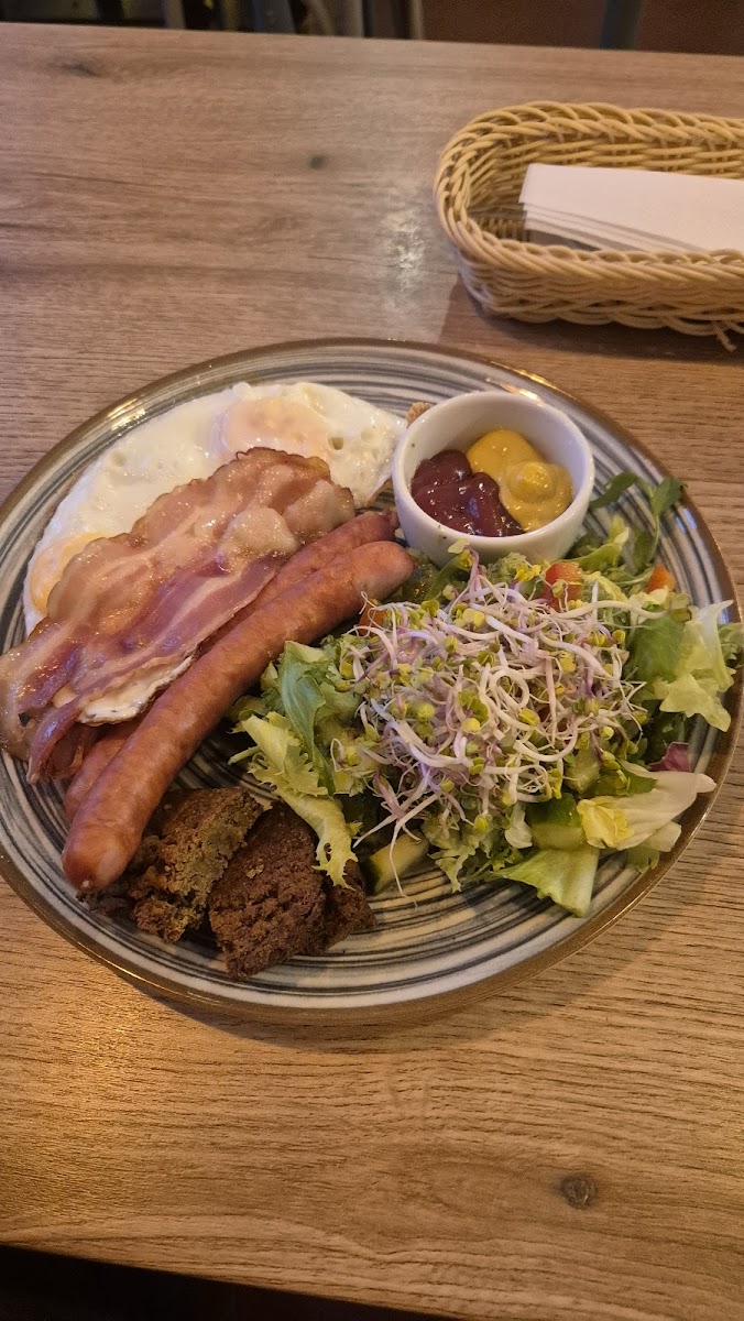 The food was great, especially thinking that it had a big vegetarian choice which is often hard to find. We had the scrambled eggs with potato pancakes which I thought it would be actual big in one piece, but it was instead in small pieces in the salad. The waitress was a bit slow and confused when it came to the payment change but we were not in a rush, so it was ok. Overall great place, atmosphere and food.